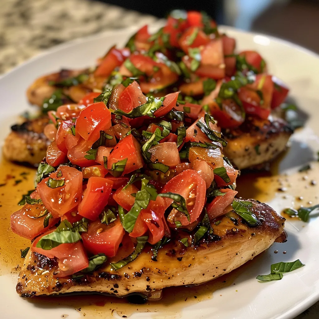 Succulent chicken breasts topped with a vibrant tomato-basil bruschetta, finished with balsamic glaze for a restaurant-style dish. Fresh, aromatic, and bursting with flavor—perfect for impressing guests.