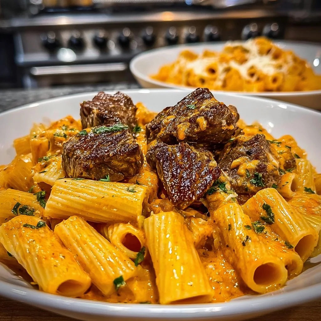 Serve Cajun Steak Tips with Cheesy Rigatoni hot. You can place it in a large serving dish or serve it on individual plates. Garnish with chopped parsley for a nice touch. This dish pairs well with a side salad or crusty bread.