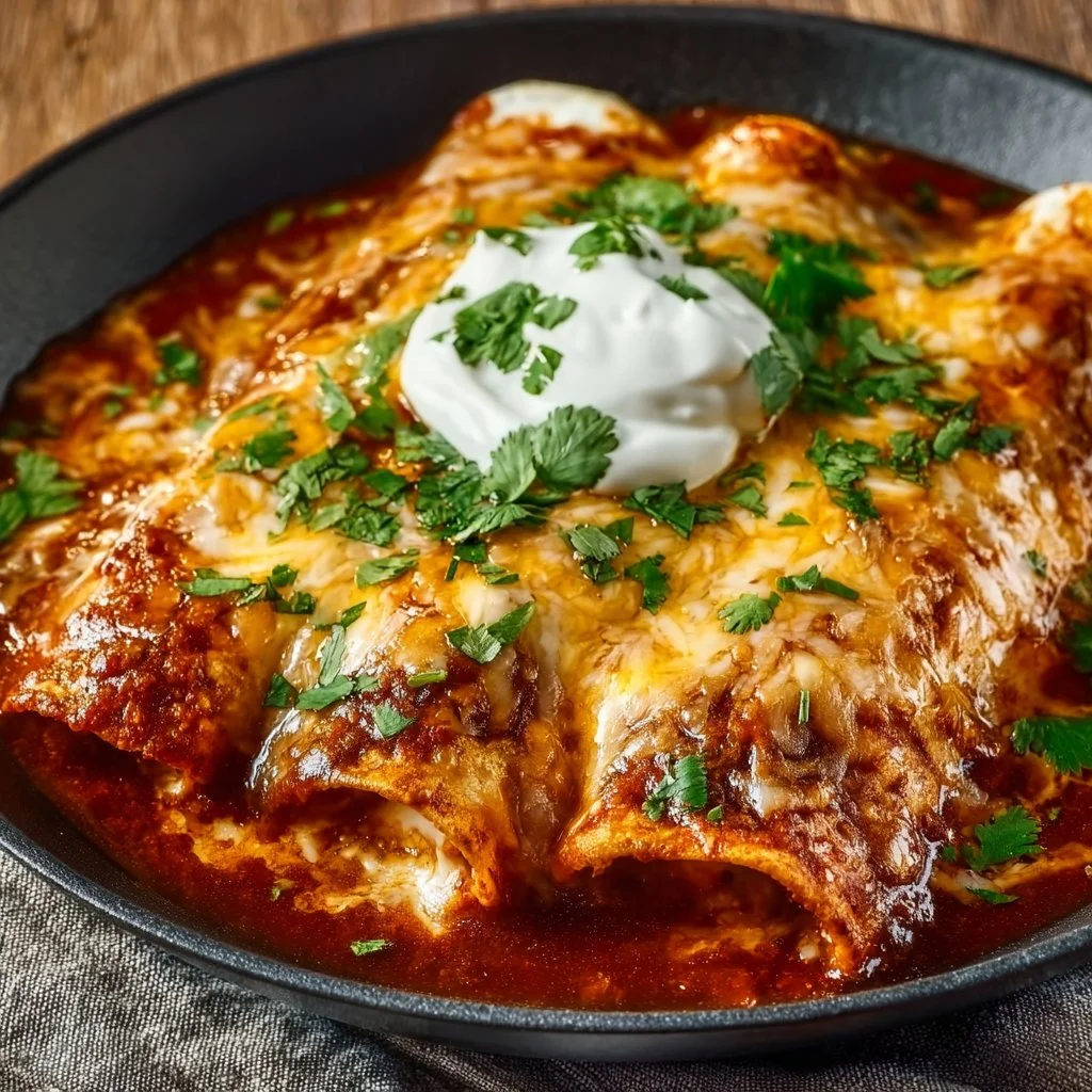 - Rest and garnish. Let the enchiladas rest a few minutes before serving. Sprinkle chopped cilantro and serve with sour cream.