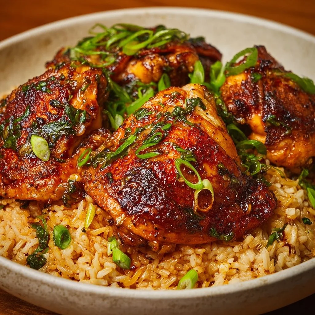 - Arrange chicken thighs over the rice, cover, and cook on low-medium heat for 15-20 minutes.