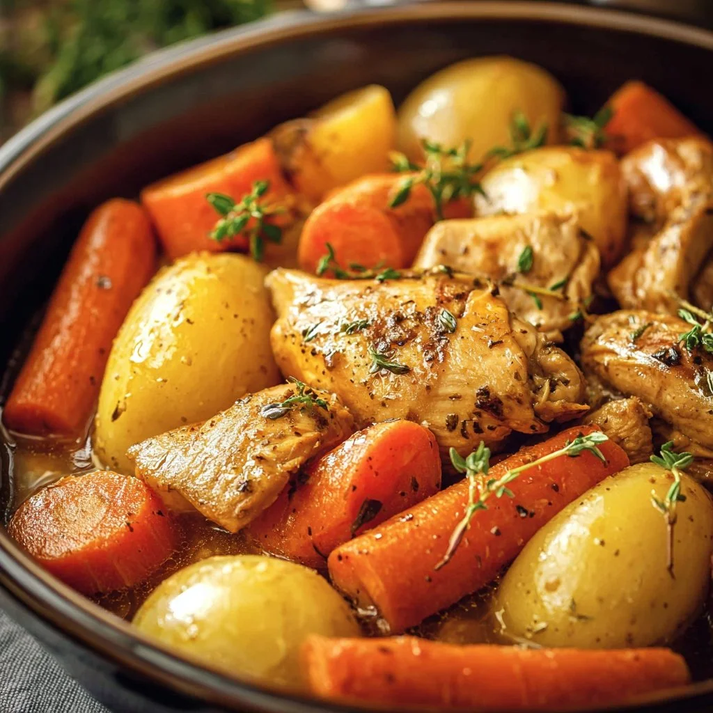 You can adapt this recipe for baking in the oven. Place the ingredients in a large baking dish, cover with aluminum foil, and bake at 375°F (190°C) for about 1.5 hours, or until the chicken and vegetables are tender.